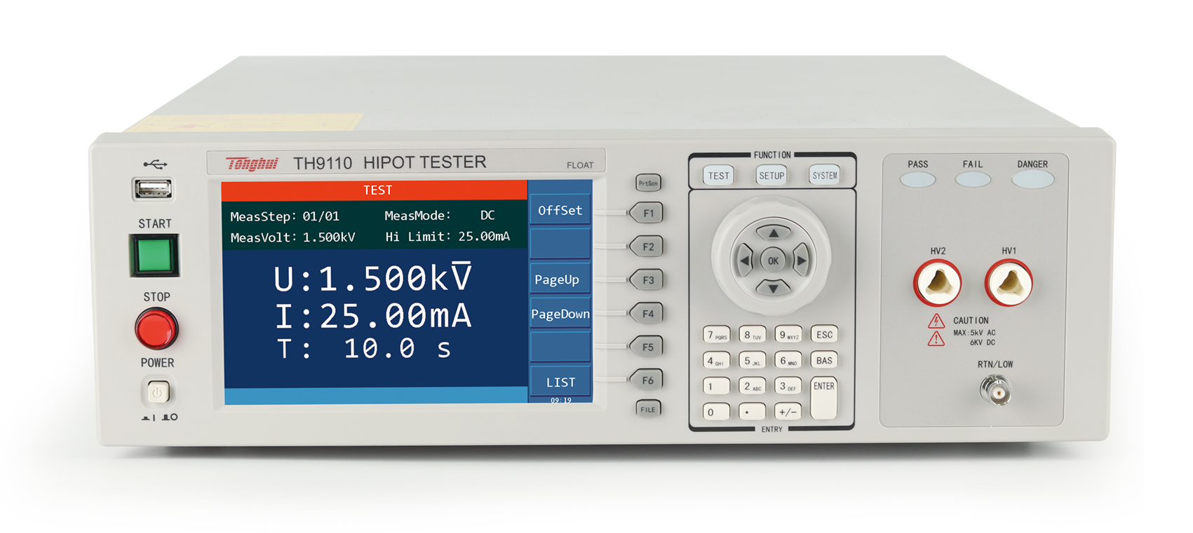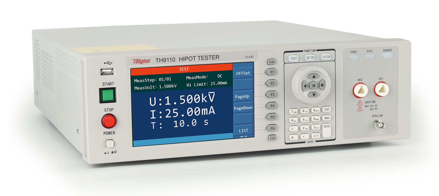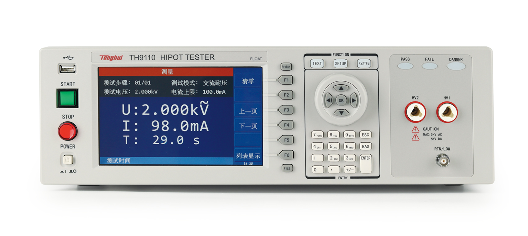 ■?TH9110/TH9110A是集同惠多年电气安规测试仪的设计经验,新推出的具有500VA功率,最大输出交流5kV/100mA的新一代交直流耐压/绝缘电阻测试仪,符合大功率耐压测试需求,符合EN50191的设备安全标准。TH9110/TH9110A系列除了基本的交流、直流、绝缘电阻测试外,增加了崩溃电压测试功能,可分析产品的击穿点电压,满足特定客户对产品高压可靠性检测的要求; 具有开短路检测功能,解决了用户在测试安规产品时的可靠性和准确性问题,输出时同步进行接触检查,避免漏检,提升测试可靠度与效率。TH9110/TH9110A使用7寸LCD彩色显示器,测试结果用大字符显示,更加清晰直观,方便操作与判断。高压浮动输出设计、触电保护功能等,确保了客户在接触到高压测试端的时候也不会被电击伤害,保证操作人员的人身安全。