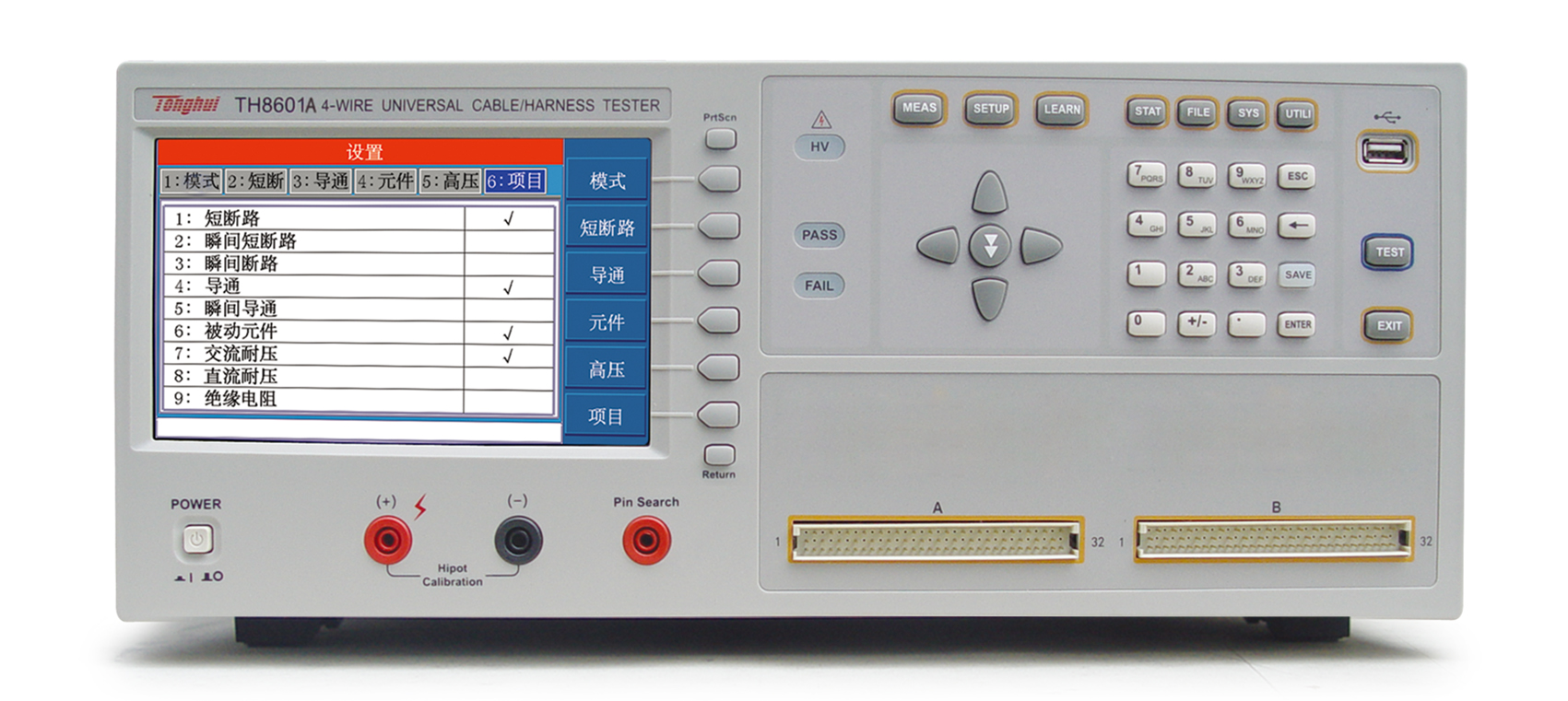 ■?TH8601系列四端线材综合测试仪是专用于各种线缆,线束和排 线品质及连接可靠性检验的多功能,自动化的线材综合参数测试 系统。该系统提供可编程的恒流恒压源以及高压源,测试项目涵盖了导通,被动元件(电感,电阻,电容,二极管),交直流耐压,绝缘电阻各种高低压参数。本系统采用先进的LCR数字采样及高速长寿命通道切换技术,大大提高了测试精度,速度以及使用寿命。采用高低压分离技术,大大的提高绝缘电阻的测试性能。丰富的接口设计,本仪器还提供RS232, RS485, GPIB, USB, LAN, Handler等接口,便于用户运用于自动化检测和自动化产线。