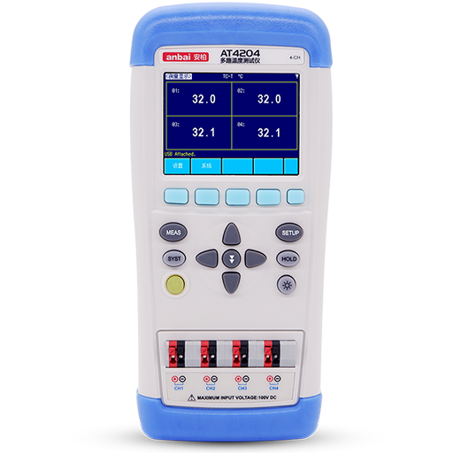 AT4204手持式多路温度测试仪采用高性能32位ARM微处理器控制,可同时对4路温度数据进行采集,上超下超报警和通讯传输,兼容K/N/E/J/T/R/S/B型热电偶,响应速度快,数据稳定,同时具备断偶检测功能。超低功耗设计和高密度SMD装配工艺,真彩TFT液晶显示屏,并具有键盘,触摸屏 双控制。采用锂电池供电,USB通讯。中英文操作界面可快速切换。仪器标配的数据采集软件为您进行数据分析提供强有力的支持!