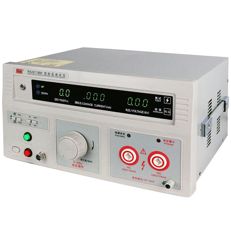 美瑞克RK2671系列耐压测试仪是测量耐压强度的仪器,可以直观、准确、快速地测试各种被测对象的击穿电压、漏电流等电气安全性能指标,并可以作为高压源用来测试元器件和整机性能。